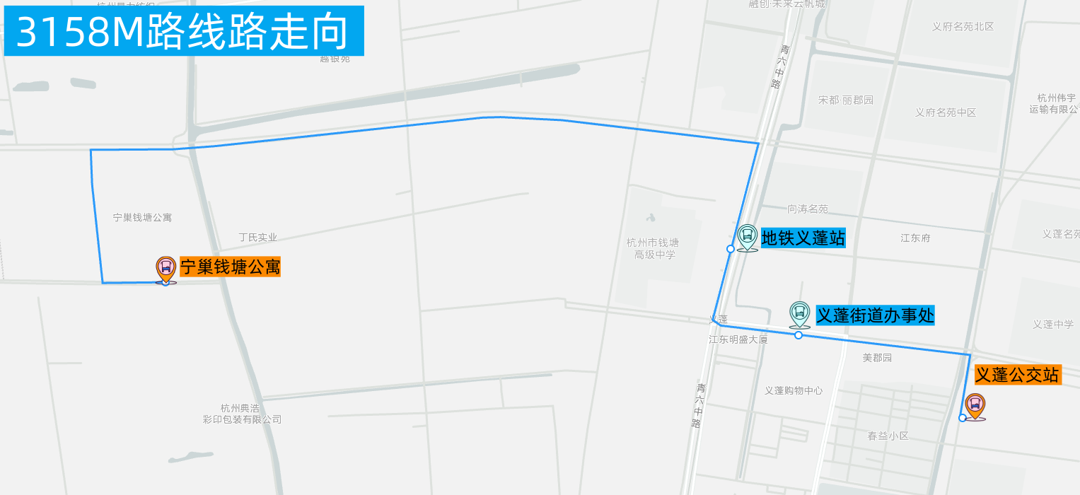 线路走向不变,钱塘健康驿站更名为宁巢钱塘公寓。变更后的首末站:宁巢钱塘公寓至义蓬公交站。