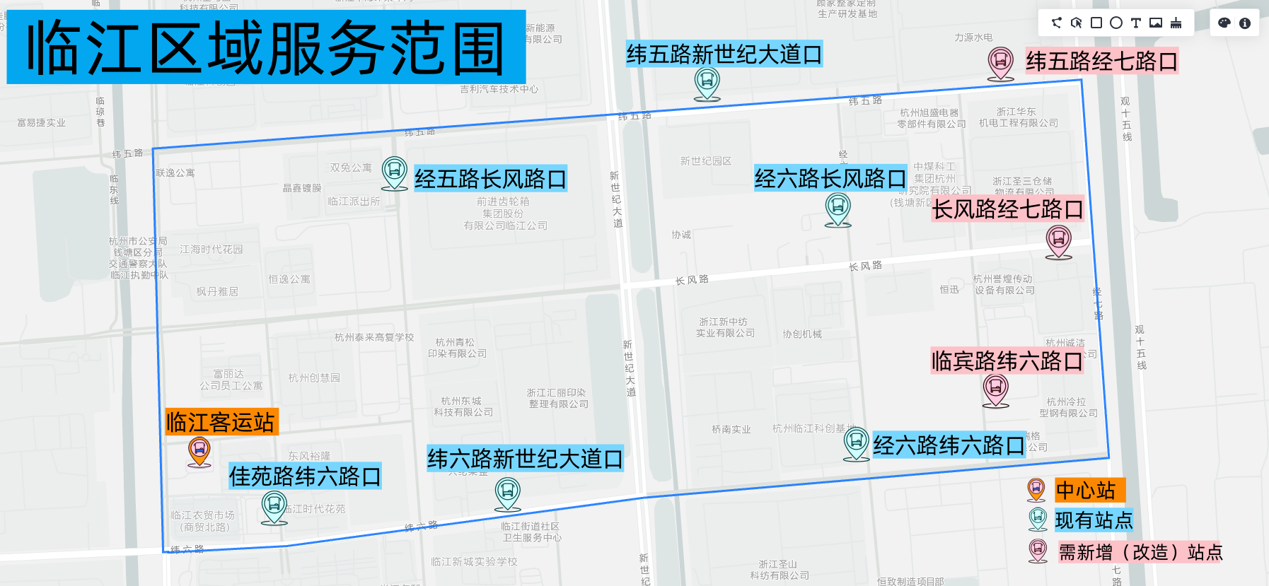 预约停靠站点共10只,分别为:临江公交站、佳苑路纬六路口、纬六路新世纪大道口、经六路纬六路口、临宾路纬六路口、长风路经七路口、纬五路经七路口、经五路长风路口、纬五路新世纪大道口、经六路长风路口。