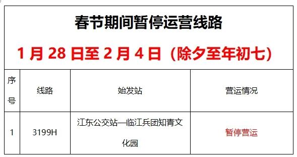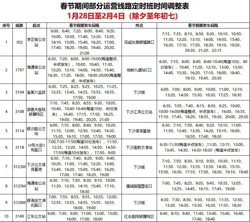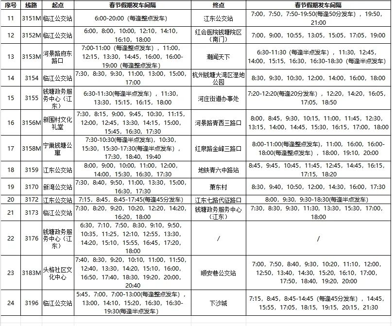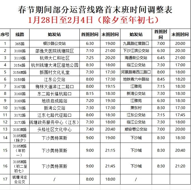 为方便春节期间市民出行需求,钱塘公交坚持以“乘客至上、服务为本”服务理念,将于1月28日起对部分线路公交时刻进行调整,具体如下: