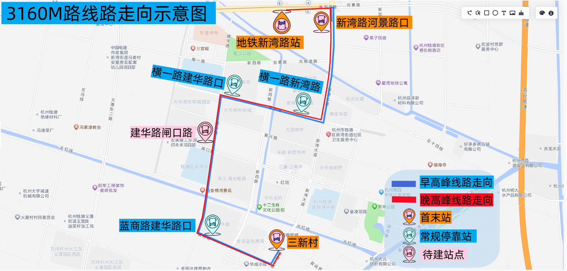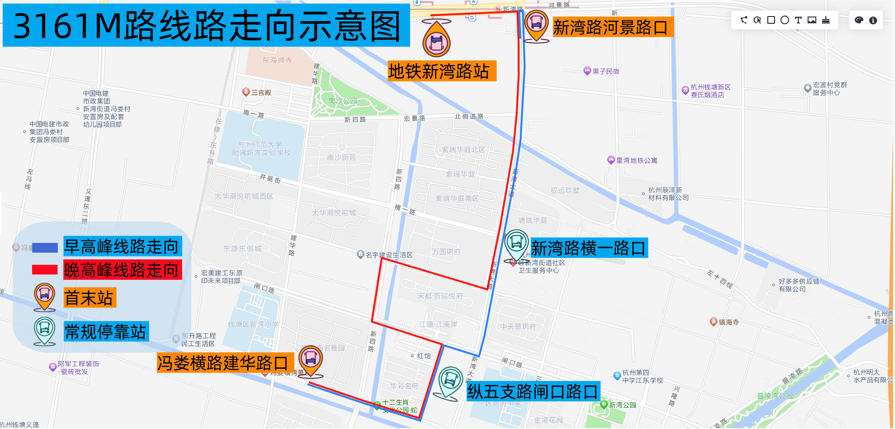 增设站点:杭四中江东学校、新湾街道办事处、共建村、盛凌路塘新线口、新南村5对停靠站点。