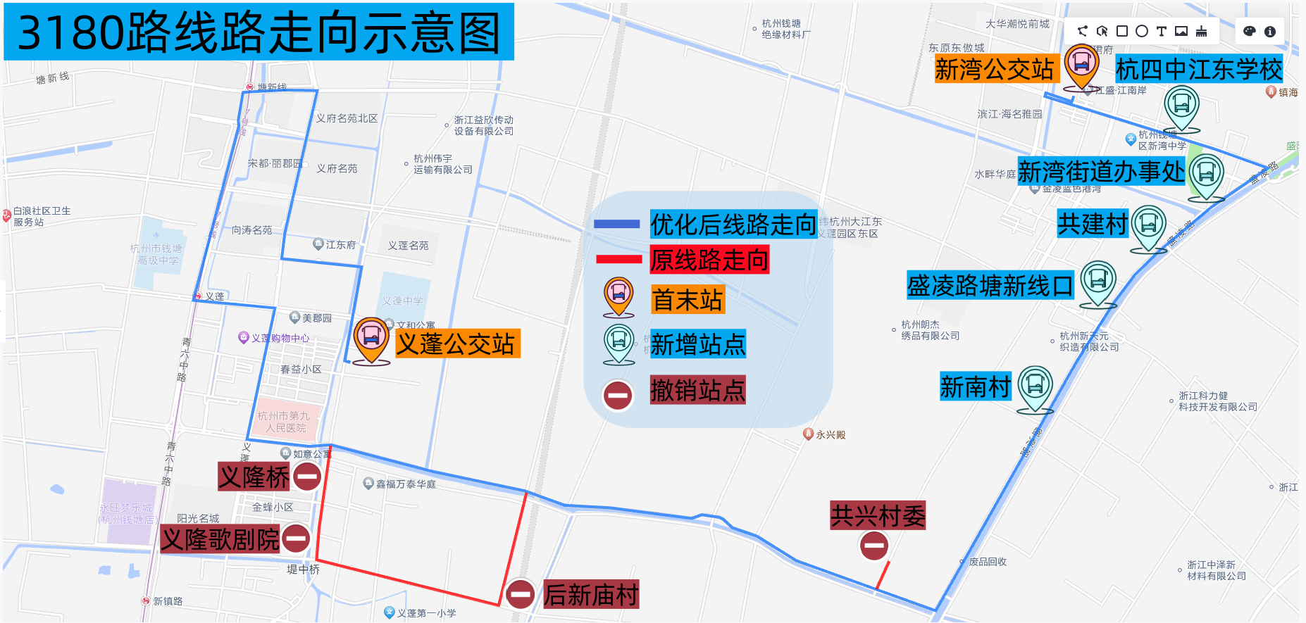撤销站点:义隆桥、义隆歌剧院、后新庙村3对停靠站点。
