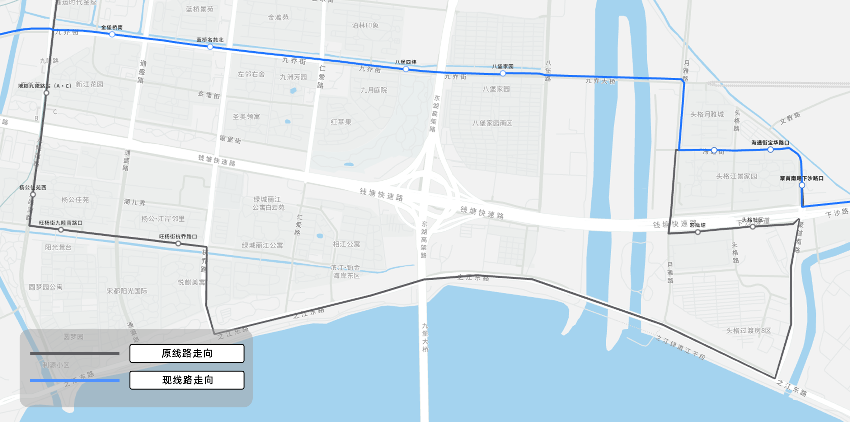 自钱塘快速路施工建设以来,受限于聚首南路、九乔街等道路未完全贯通,1797路长期采用绕行方案,线路走向沿之江东路迂回,不仅绕得远,沿线能服务的小区也不多。