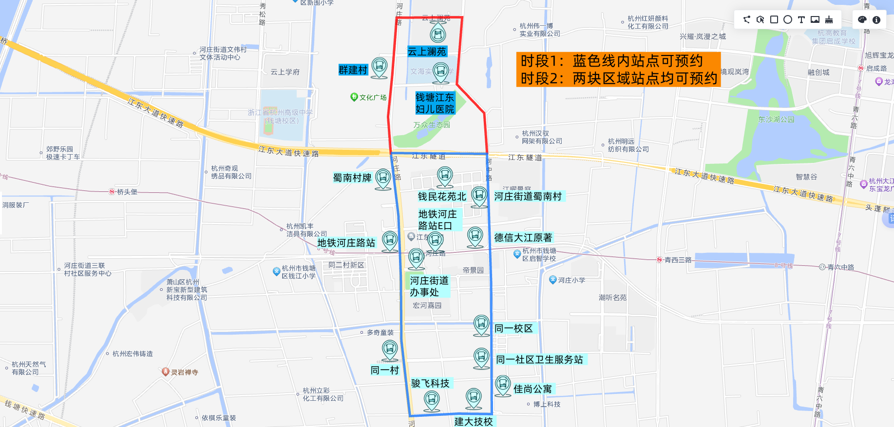 时段1:6:30-8:30/17:00-19:30,云公交服务范围调整为北至江东大道,西至河庄大道,南至钟秀街,东至河中路。