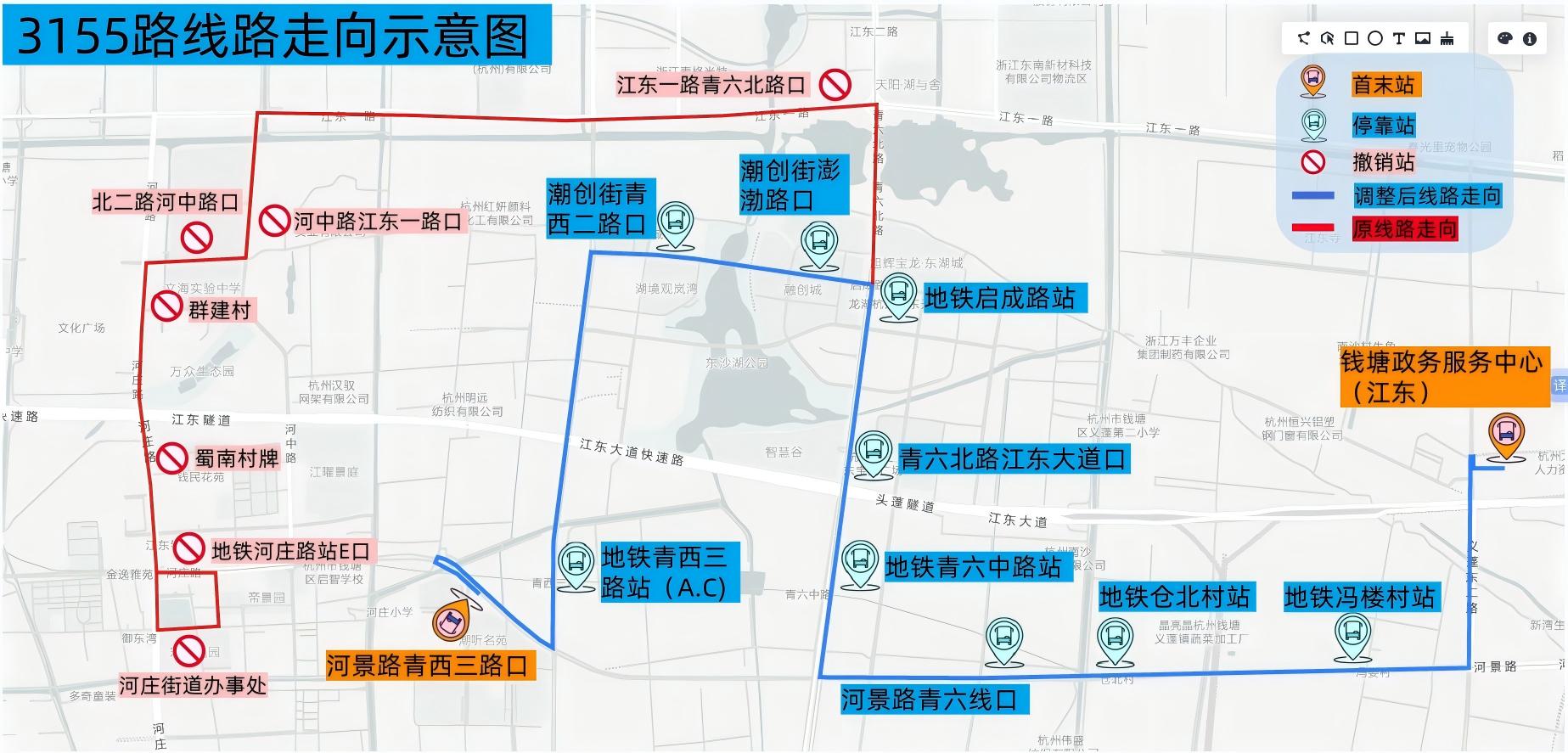 首末站调整:钱塘行政服务中心(江东)至河庄街道办事处调整为钱塘行政服务中心(江东)至河景路青西三路口。
