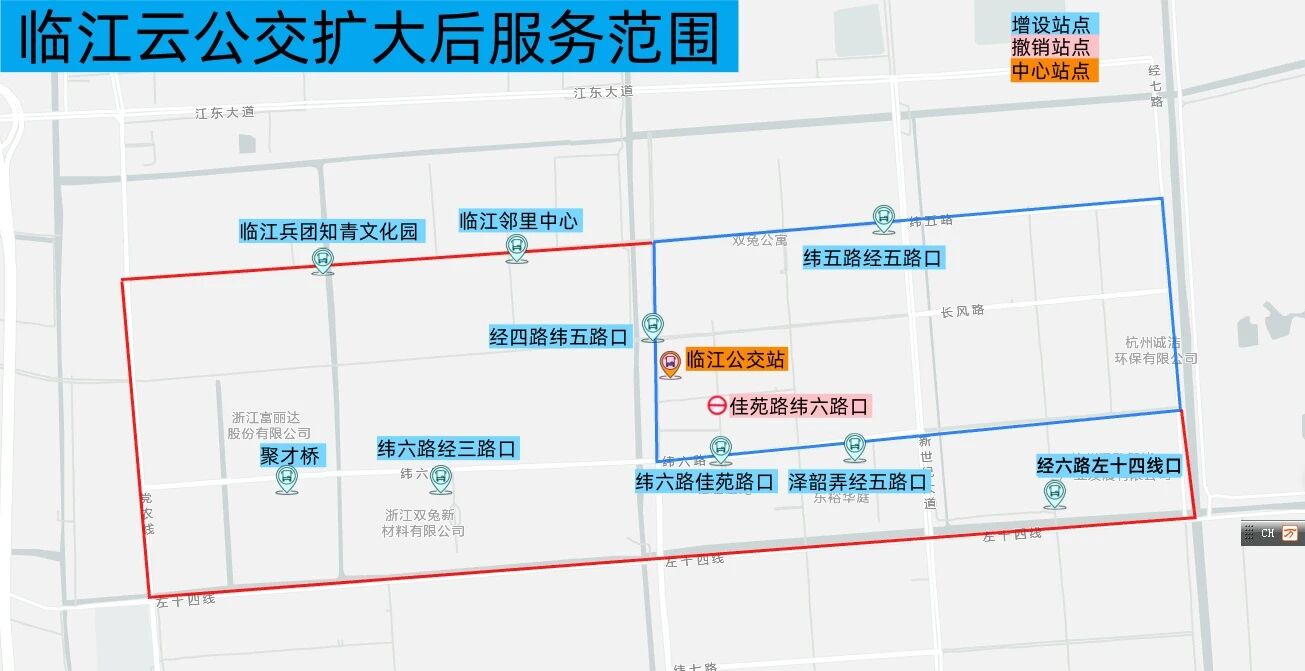优化后共设置18个预约站点(含新增的9个),分别为:临江公交站、纬六路佳苑路口(新增站点)、纬六路新世纪大道口、经六路纬六路口、临宾路纬六路口、长风路经七路口、纬六路经七路口、纬五路经六路口、纬五路经五路口(新增站点)、纬五路新世纪大道口、经六路长风路口、临江兵团知青文化团(新增站点)、临江邻里中心(新增站点)、经四路纬五路口(新增站点)、经六路左十四线口(新增站点)、泽韶弄经五路口(新增站点)、聚才桥(新增站点)、纬六路经三路口(新增站点)。