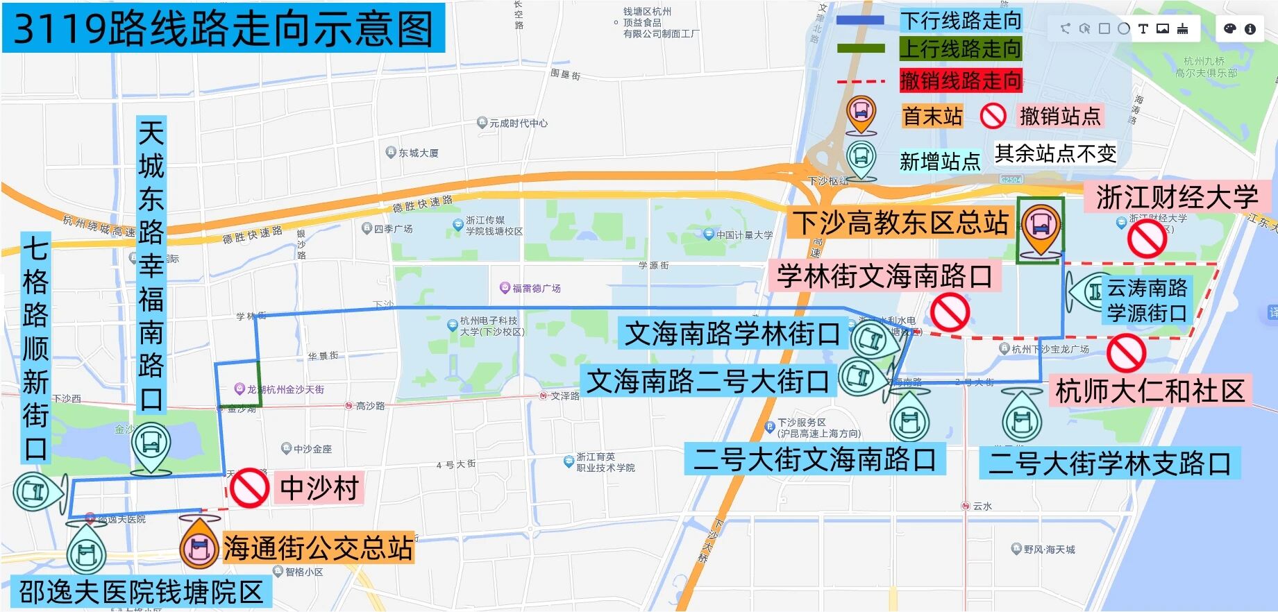 撤销站点:杭师大仁和社区、浙江财经大学、学林街文海南路口、中沙村4对停靠站点。