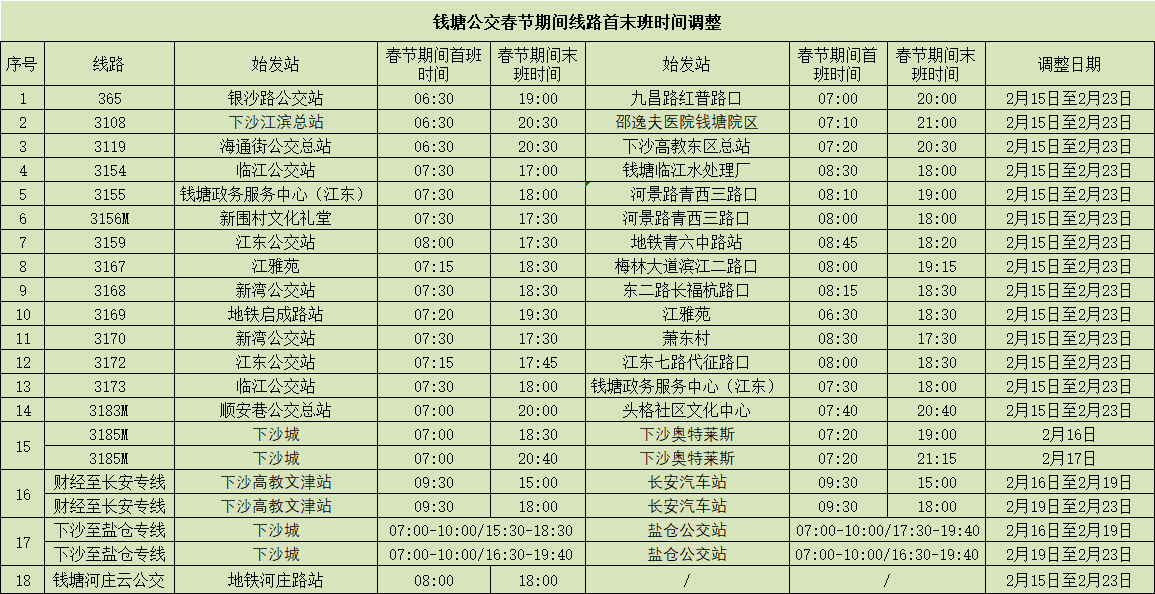 365路等18条线路,优化春节期间首末班发车时间。(详见表格)