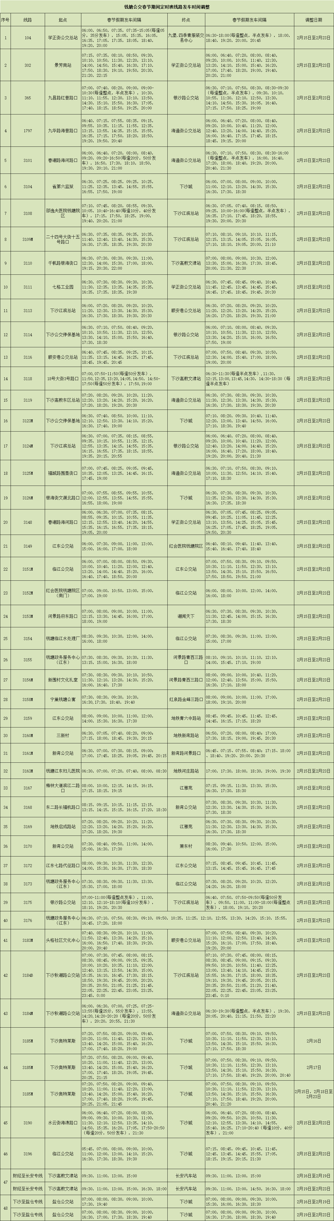 104路等48条线路,调整节日期间定时班次发车时刻。(详见表格)