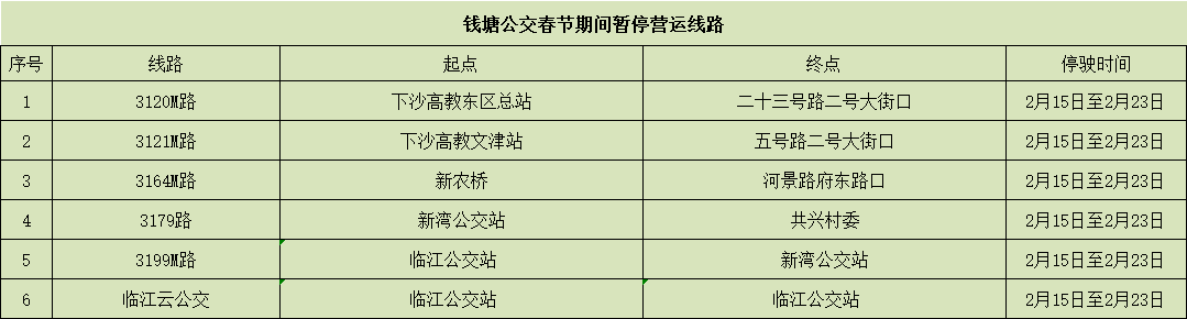 3120M路等6条线路,春节期间暂停运营。(详见表格)